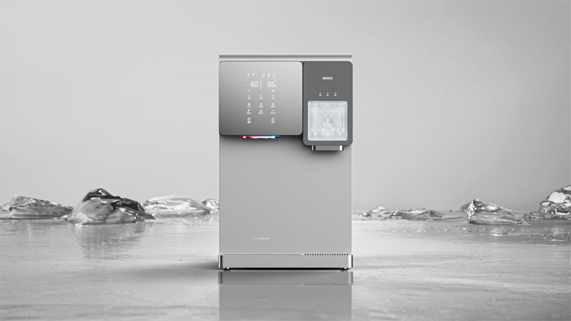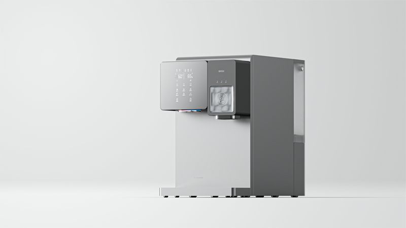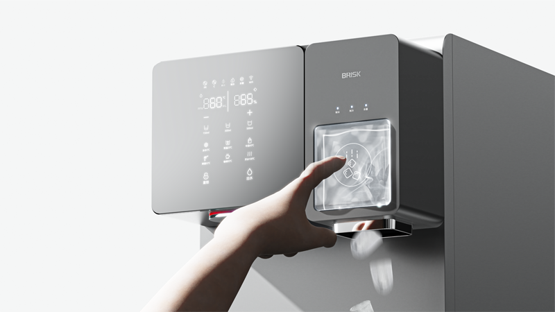 该机型为台面式设计,无需专业安装,使用方便,将传统净饮水机与制冰机功能整合,功能强大,体积小巧。整体设计风格极简,理性克制,不浮夸,沉静内敛。功能分区清晰明了易操作,在其强大的功能基础上,极大降低使用难度,体现人文关怀。设计最大的亮点在于双区操作形式,左区饮水,触摸式大屏,自定义功能丰富;右区制冰,“大冰块”物理出冰按键,操作一目了然。